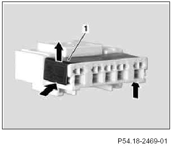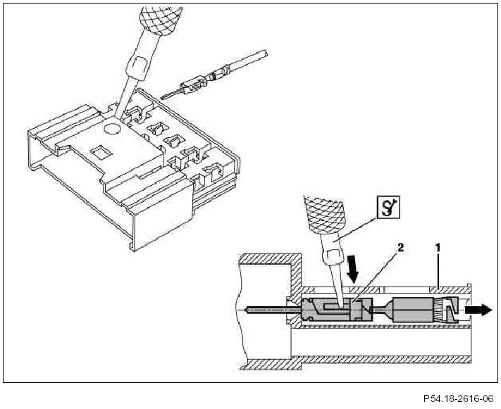 5 Press down the spring shackle of the contact pin (2) and push the contact pin (2) out of the contact cavity of the connector housing (1). Tug the corresponding cable at the same time to assist the unpinning procedure.