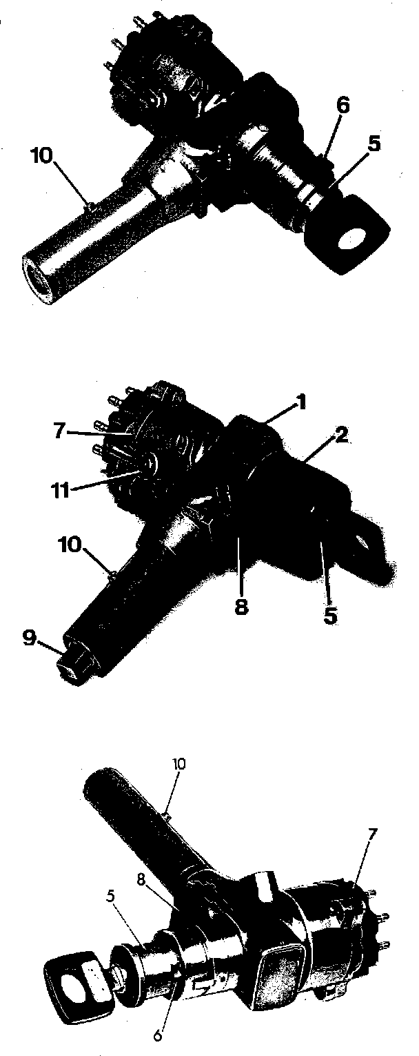 NOTE: THREE types of steering lock assemblies were used on this vehicle. VERSION 1 uses a plug-type chrome cap. VERSION 2 uses a plug-type plastic cap. VERSION 3 uses a screw-on cap. Component replacement for all three types is the same except where indicated in the text.