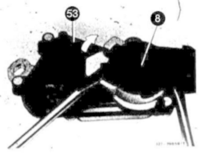 1 Loosen detent for plug of starter lockout switch (8), while turning white plastic ring (arrow) upwards in direction of arrow.