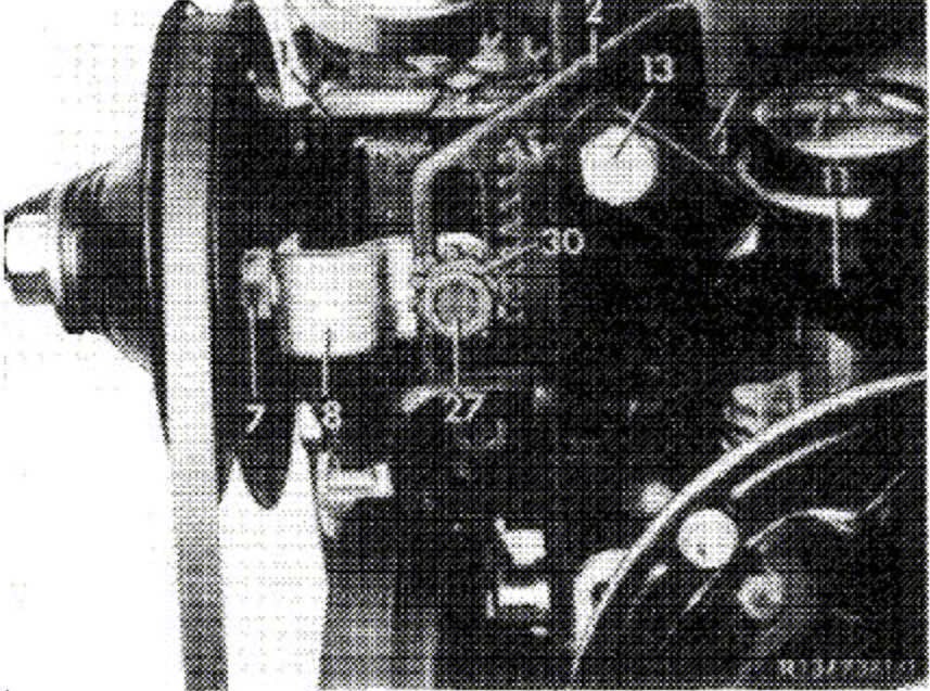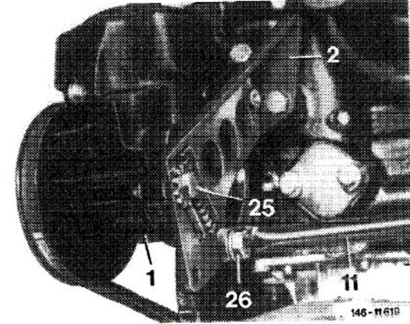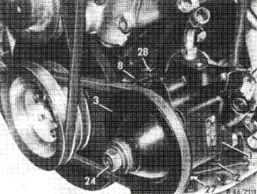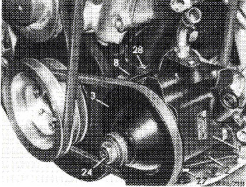 27. Mount vee-belt. Push power steering pump from crankcase by means of gear wheel until the correct belt tension is attained. Then tighten hex. socket screws (27) and (28).