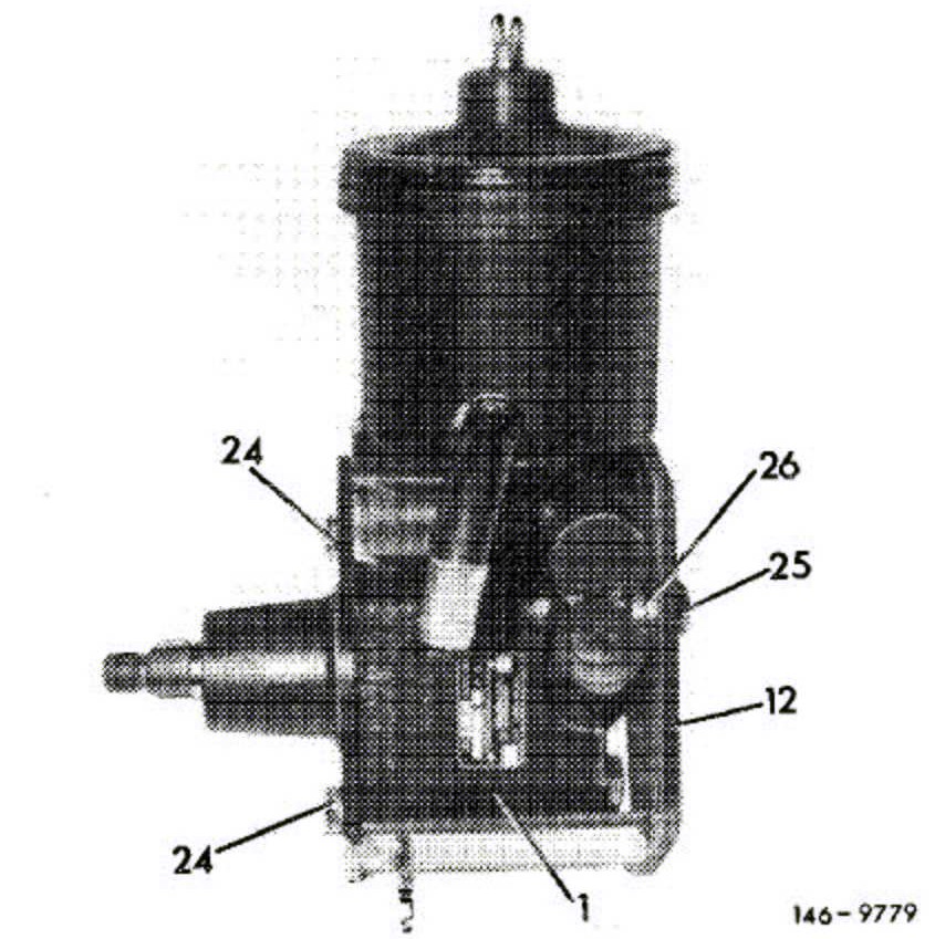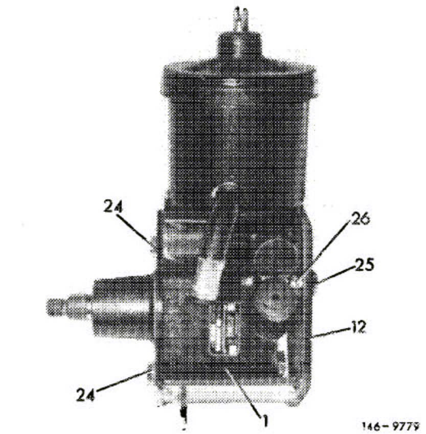 29. Insert power steering pump into carrier (12) and attach with hex. screws. The rear screw (25) has inch threads.