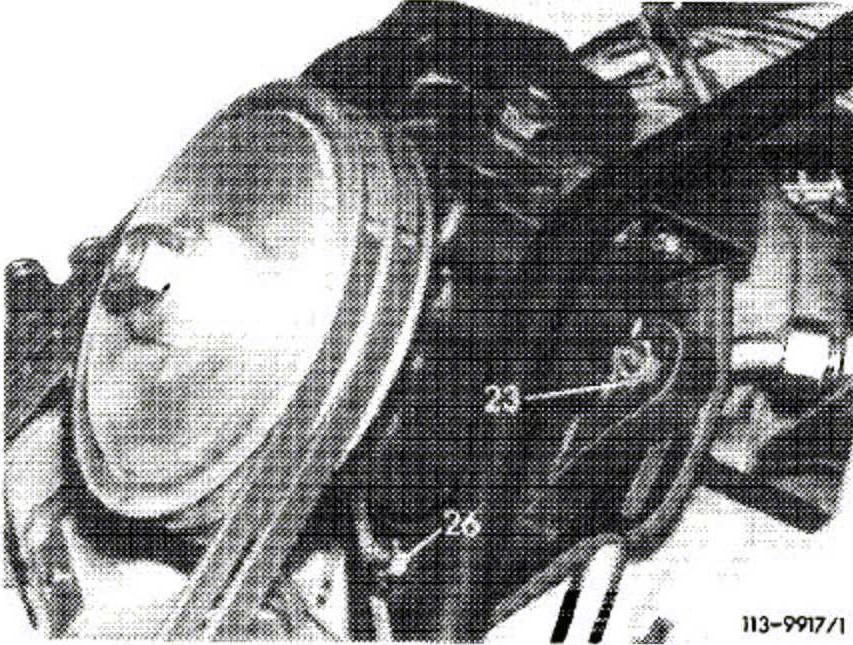 20. Swivel power steering pump toward engine by means of tensioning screw (23) and remove vee-belt from pulley.