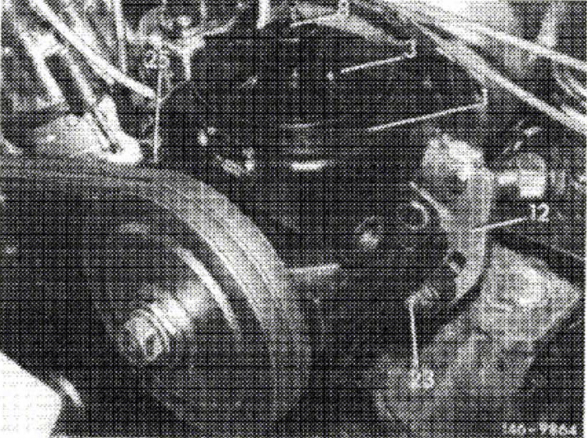 8. Loosen hex. nuts (22) at fastening plate and hex. screw (23) on support (14). Push power steering pump toward engine and take both vee-belts from pulley (10).
