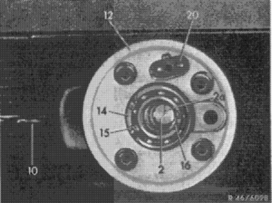 16. Turn steering to center position. For this purpose, unscrew closing plug from steering housing. Turn steering worm (3) until the center point in power piston (5) is accurately under threaded bore.