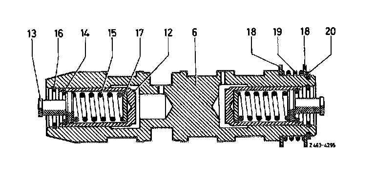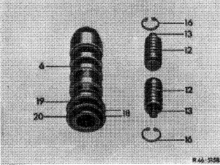 On 1st version of control valve the reaction pistons have a diameter of 11 mm and the supporting pistons (13) are secured in reaction pistons by means of locking rings (14). On 2nd version (production starting middle of 1972) the diameter of the reaction pistons is 10 mm. Two spring bolts (65) are inserted in reaction pistons. On control valve 3rd version (production starting end of 1973) the reaction pistons have a diameter of 11 mm. Inside reaction pistons are compensating washer (66) and spring (67). Starting at the beginning of 1976 the control valve 4th version is installed, with a reaction piston diameter of 11.5 mm.