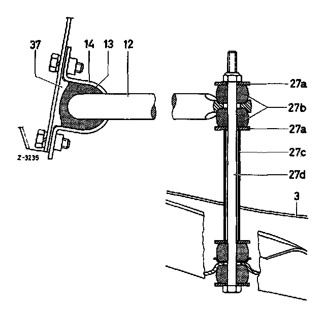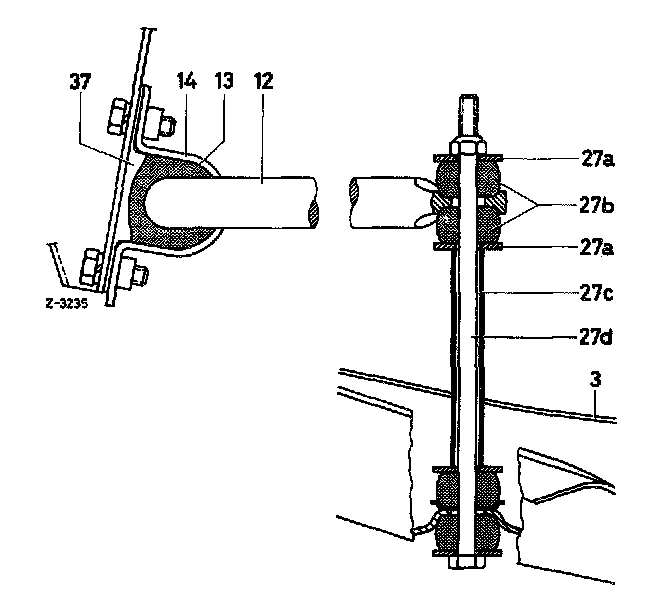 4. Slide rubber mount on torsion bar with parting slot toward front, fit locking plate (37) and attach torsion bar bearing to frame floor. Align torsion bar prior to tightening hex bolts.