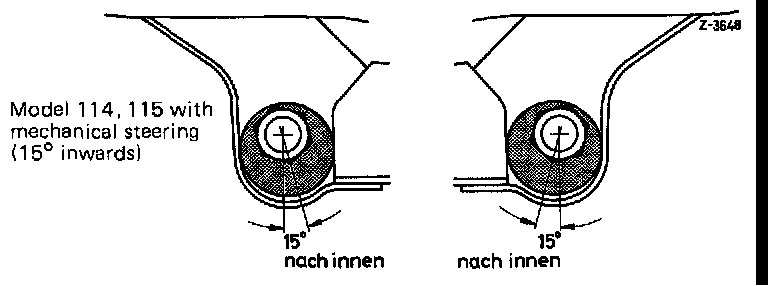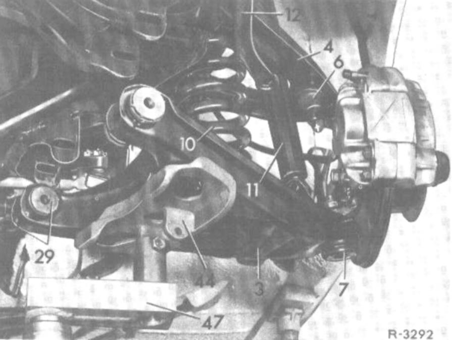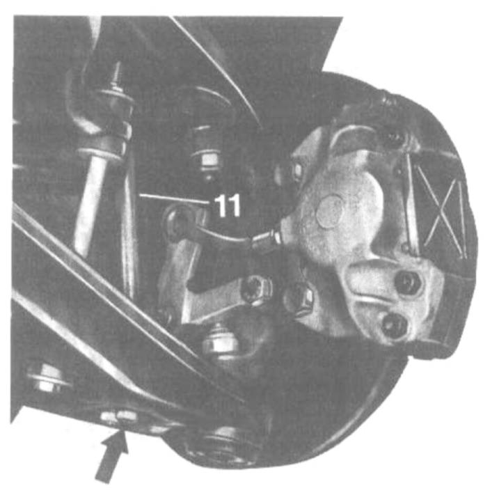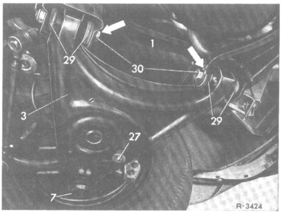 The front shock absorbers are serving simultaneously as a deflection stop for the front wheels. For this reason, loosen shock absorber suspension only when the vehicle is on its wheels or when the lower control arm is supported,