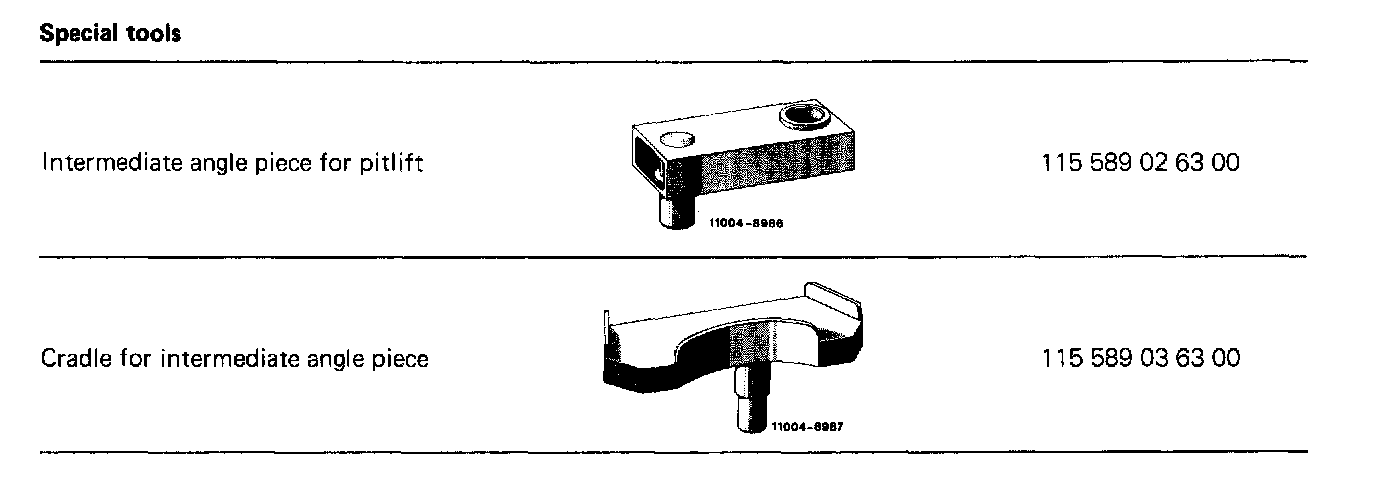 Note: Let down lower control arm for removing front spring. Use special cradle placed on pit lift for support. If the special cradle is not available or if the front axle has already been removed completely with springs, use spring tensioner BE 15 838 of assembly stand BE 15 798 for tensioning springs.