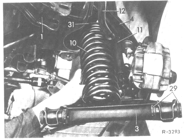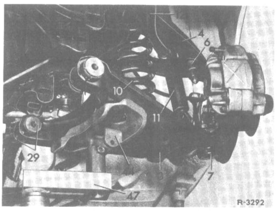 8. Carefully raise lower control arm with pit lift while making sure that the rubber mounts (29) are not damaged by the eyes on the front axle carrier.
