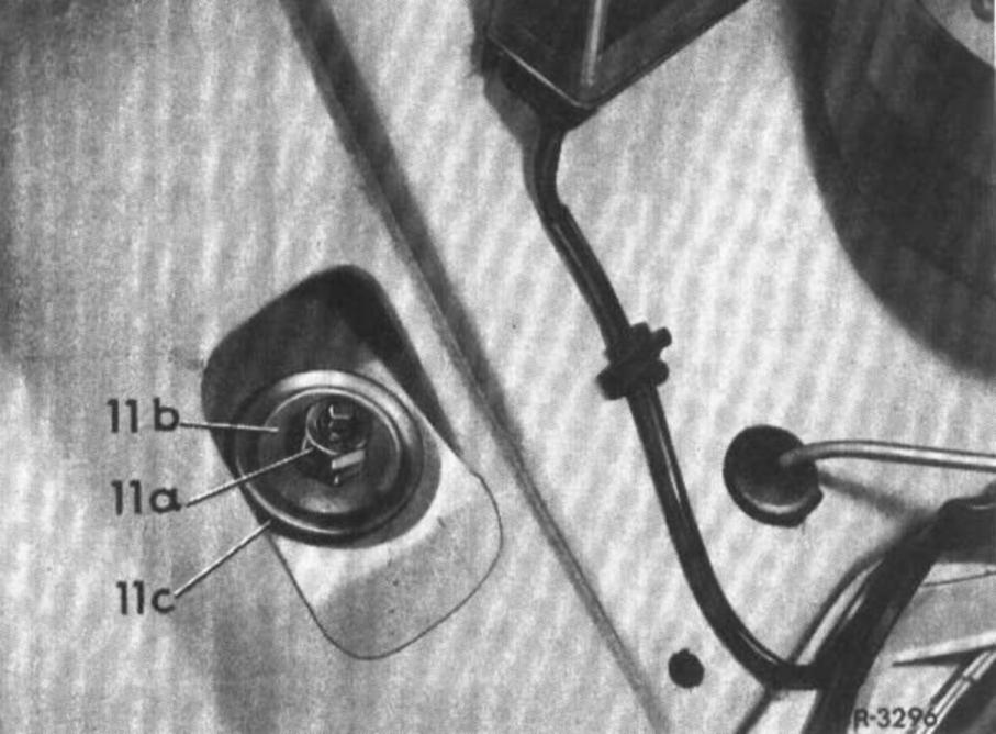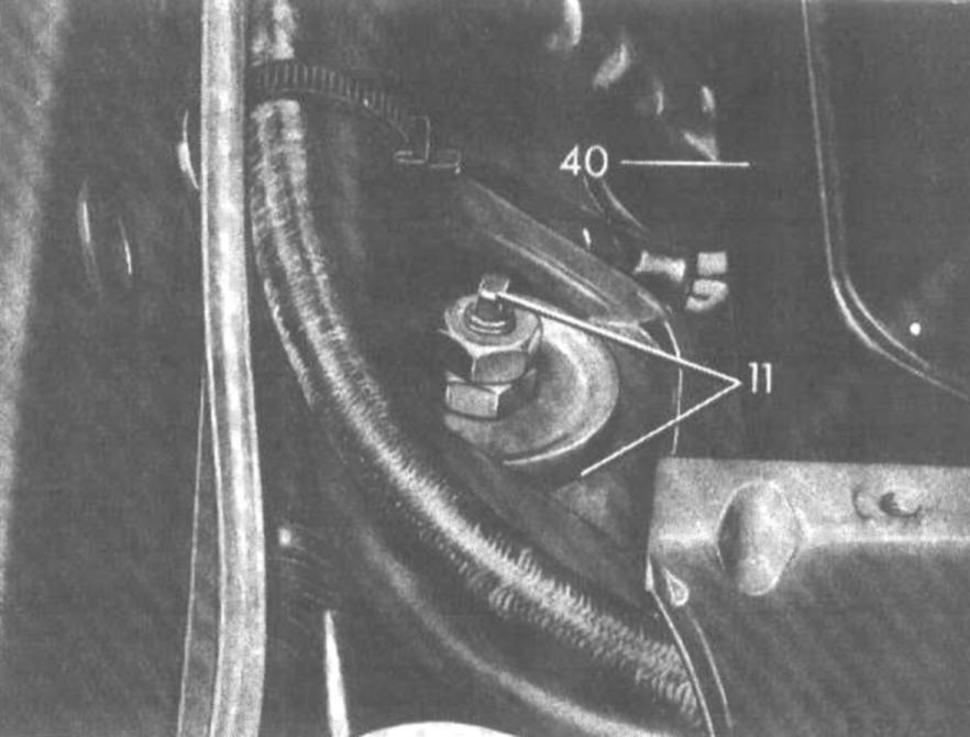 1. Loosen hex. nuts (11a) at upper shock absorber suspension, remove cup (11b) and rubber ring (11c).