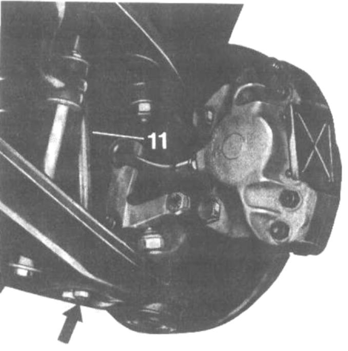 2. Loosen lower shock absorber suspension. For this purpose, unscrew hex. nuts (arrow) on lower control arm,