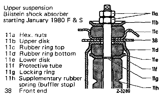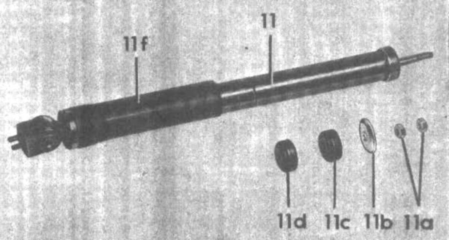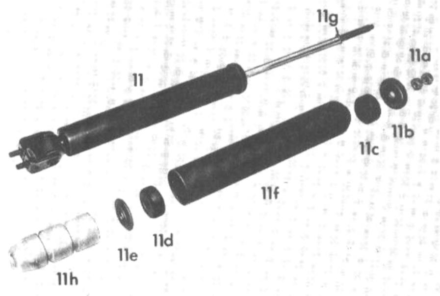 a) On shock absorber with separating piston: Pull off protective tube (11f), remove lower rubber ring (11d), lower disk (11e) and supplementary rubber spring (buffer stop) (11h).