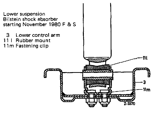 Note: The fastening bracket of the lower shock absorber suspension must be tightly seated in rubber mount, which should not be turnable within the suspension eye.