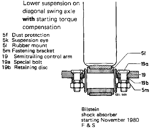 Note: On lower shock absorber suspension, two hex. bolts are screwed into semitrailing control arm of the diagonal swing axle.