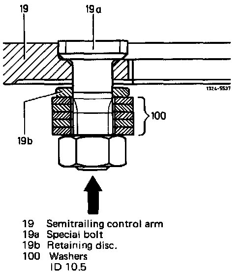 After inserting new special bolts into bores in semitrailing control arm, press retaining discs on shank of special bolts. Add approx. 5 washers with an ID of 10.5 mm to the retaining disc and press the retaining disc down on to the shank of the special bolt.