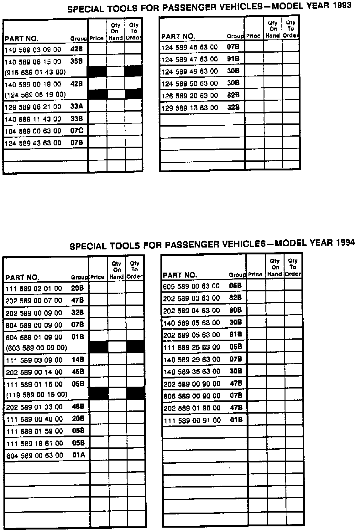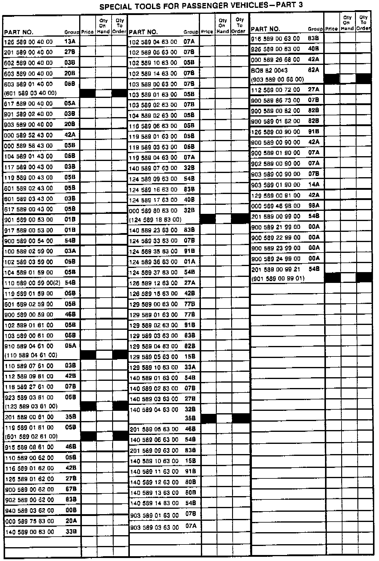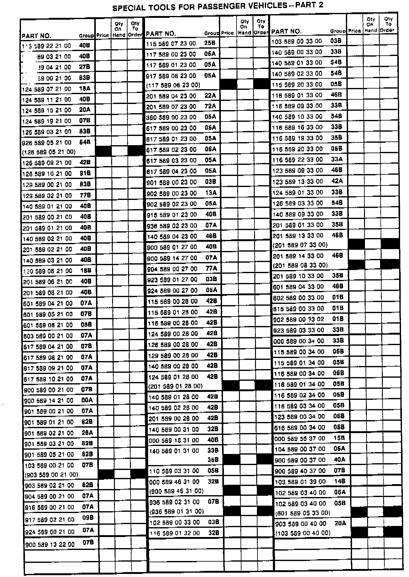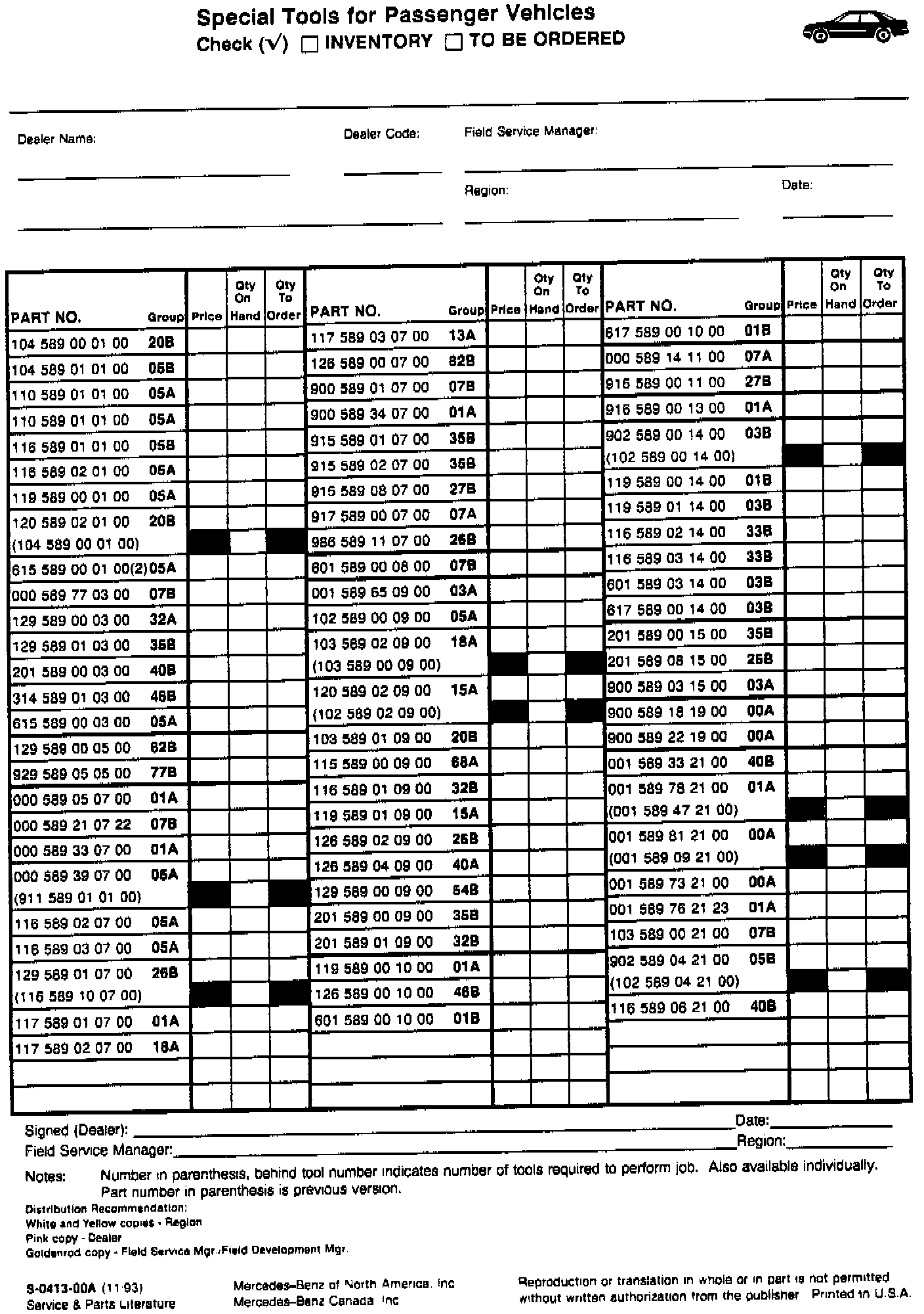 Enclosed is a sample copy of the MB-Special Tools for Passenger Vehicles Inventory list updated to include all current MB-Special Tools, category A & B, required for the service, repair and maintenance of Mercedes-Benz passenger vehicles. (Field Service Managers are receiving ten [10] copies with this bulletin). The inventory list must be completed when preparing a Service Assessment for a prospective dealer, buy-out, relocation or reorganization. It must be prepared annually as part of the Service Evaluation for all existing dealers. The list documents inventory status and acts as a worksheet to determine which tools the dealer needs to order directly from his facing PDC via MB-Net. However, new Model Year minimum A & B tools will continue to be distributed automatically.