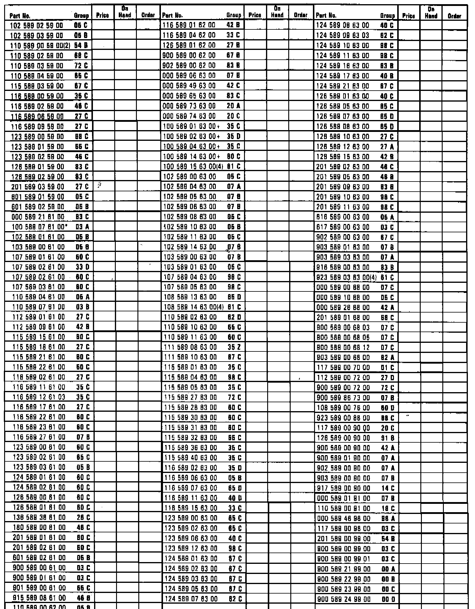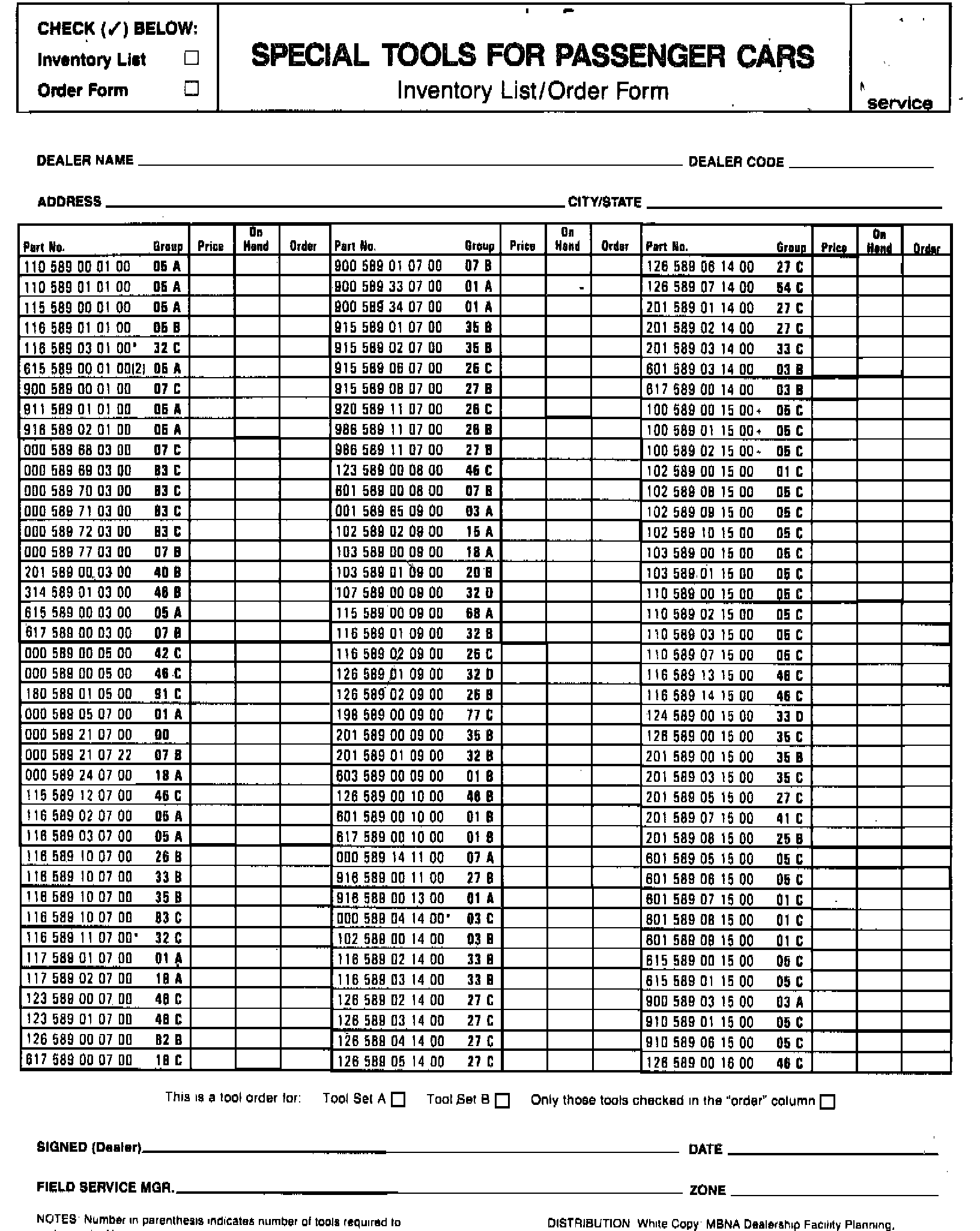 Included is a sample copy of the Special Tool (Passenger Cars) Inventory List/Order Form updated to include all current special tools required for the service and repair of Mercedes-Benz passenger cars (Field Service Managers are receiving ten (10) copies with this bulletin). The Inventory List/Order Form must be completed when preparing a Service Assessment for a prospective dealer, buy-out, relocation or reorganization. It must be prepared annually as part of the Service Evaluation on all existing dealers. The form may be used either for an order or to document inventory status, or it may be combined to do both) as in the case of a Service Evaluation.