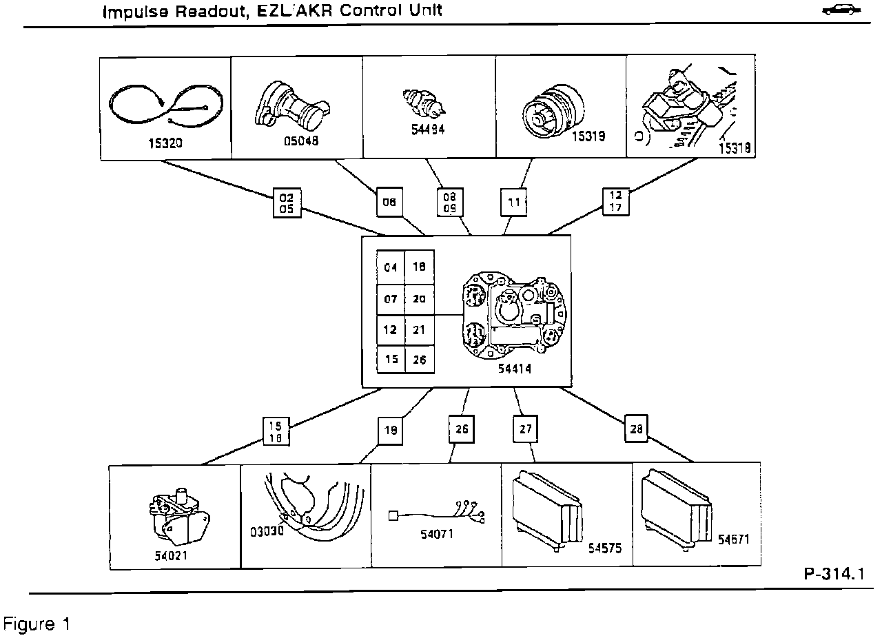 In the example (Figure 1), an EZL/AKR control unit is shown in the center surrounded by the components interconnected to it. Whenever it is possible for fault codes to be part of a damage code, the illustration provided will be similar to the example in Figure 1, ie: an electronic control unit (ECU) surrounded by the components interconnected to it.
