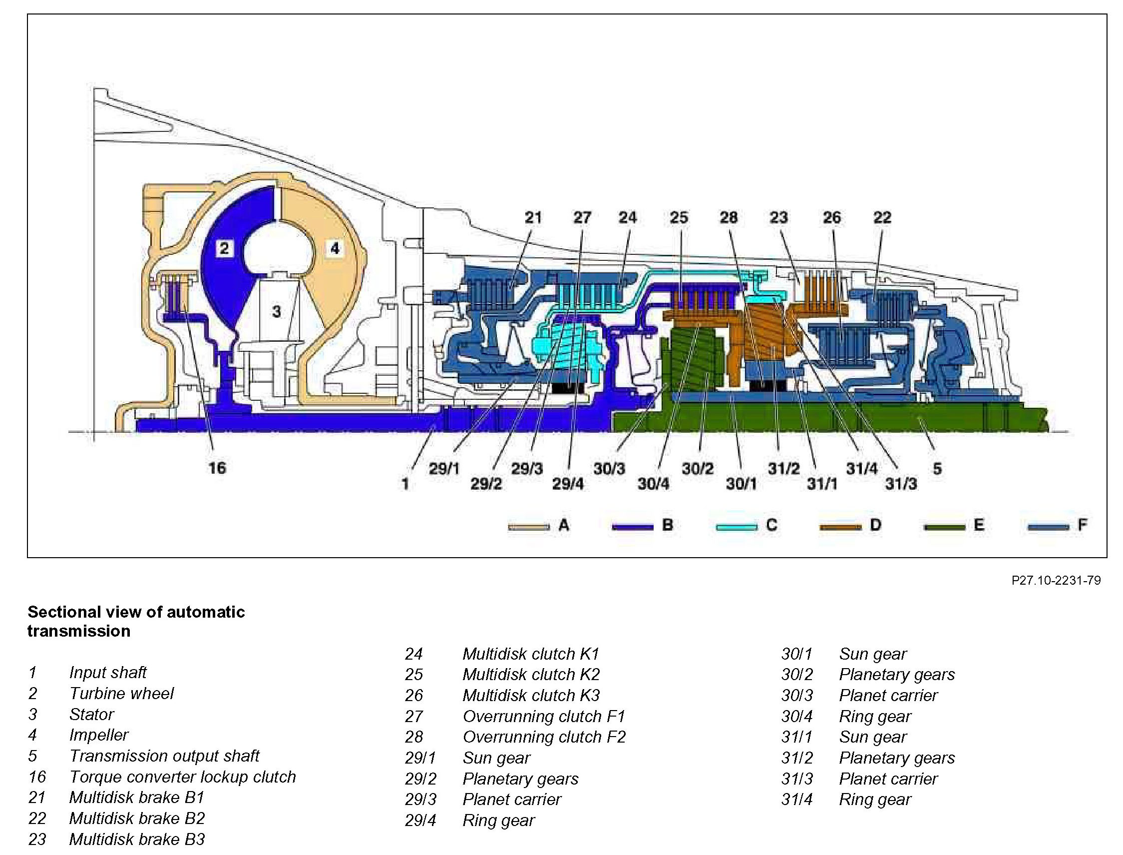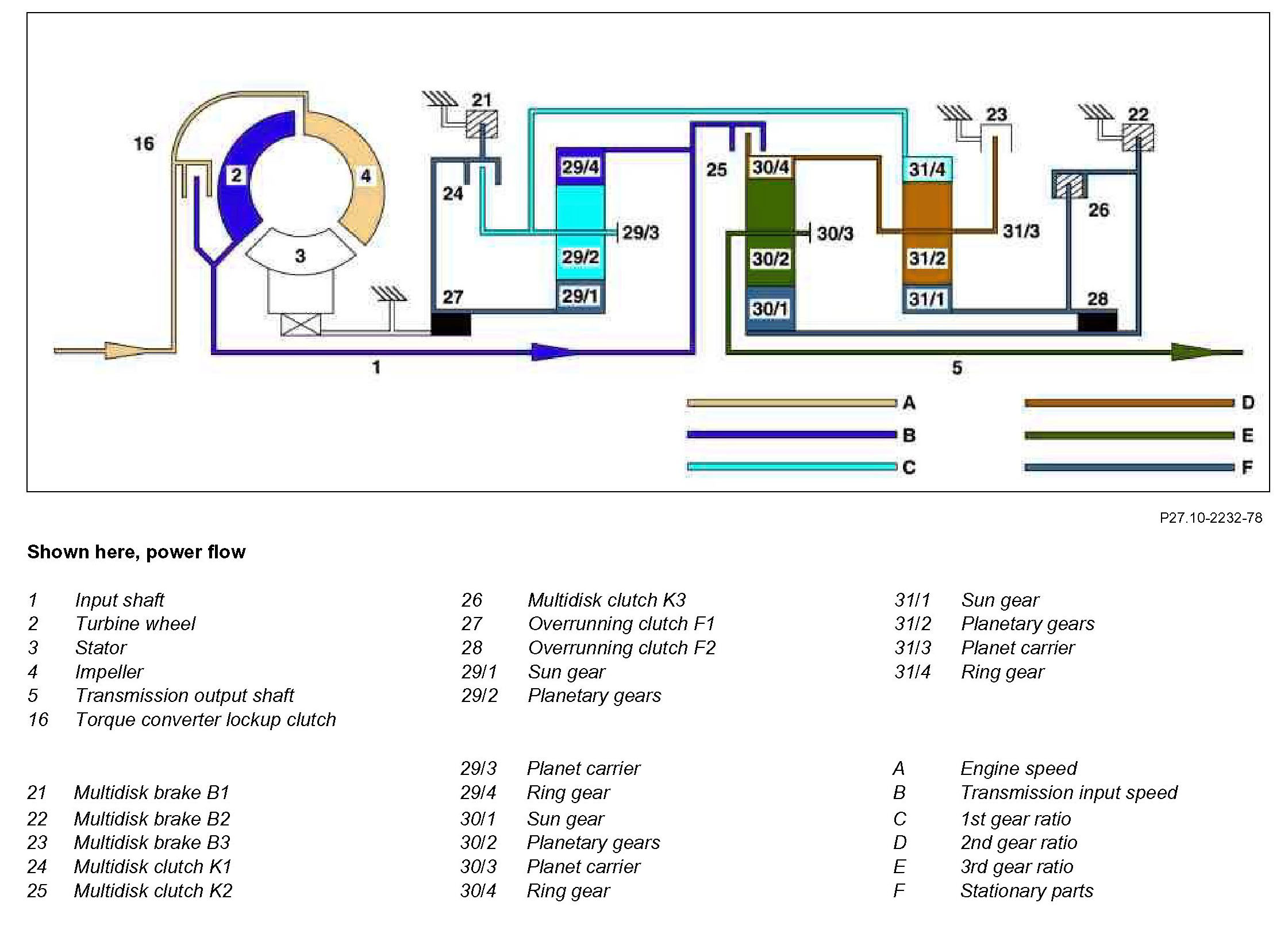 The ring gear (31/4) rotates at reduced speed due to the mechanical connection to the planet carrier (29/3). The sun gear (31/1) is supported at the housing via the engaged multidisk brake B2 (22), in drive mode, via the locked overrunning clutch F2 (28) and, in overrun mode, via the engaged multidisk clutch K3 (26). The planetary gears (31/2) roll on the fixed sun gear (31/1) and take care of a torque increase when the power is transmitted from the ring gear (31/4) to the planet carrier (31/3). The planet carrier (31/3) moves at reduced speed in the direction of engine rotation.