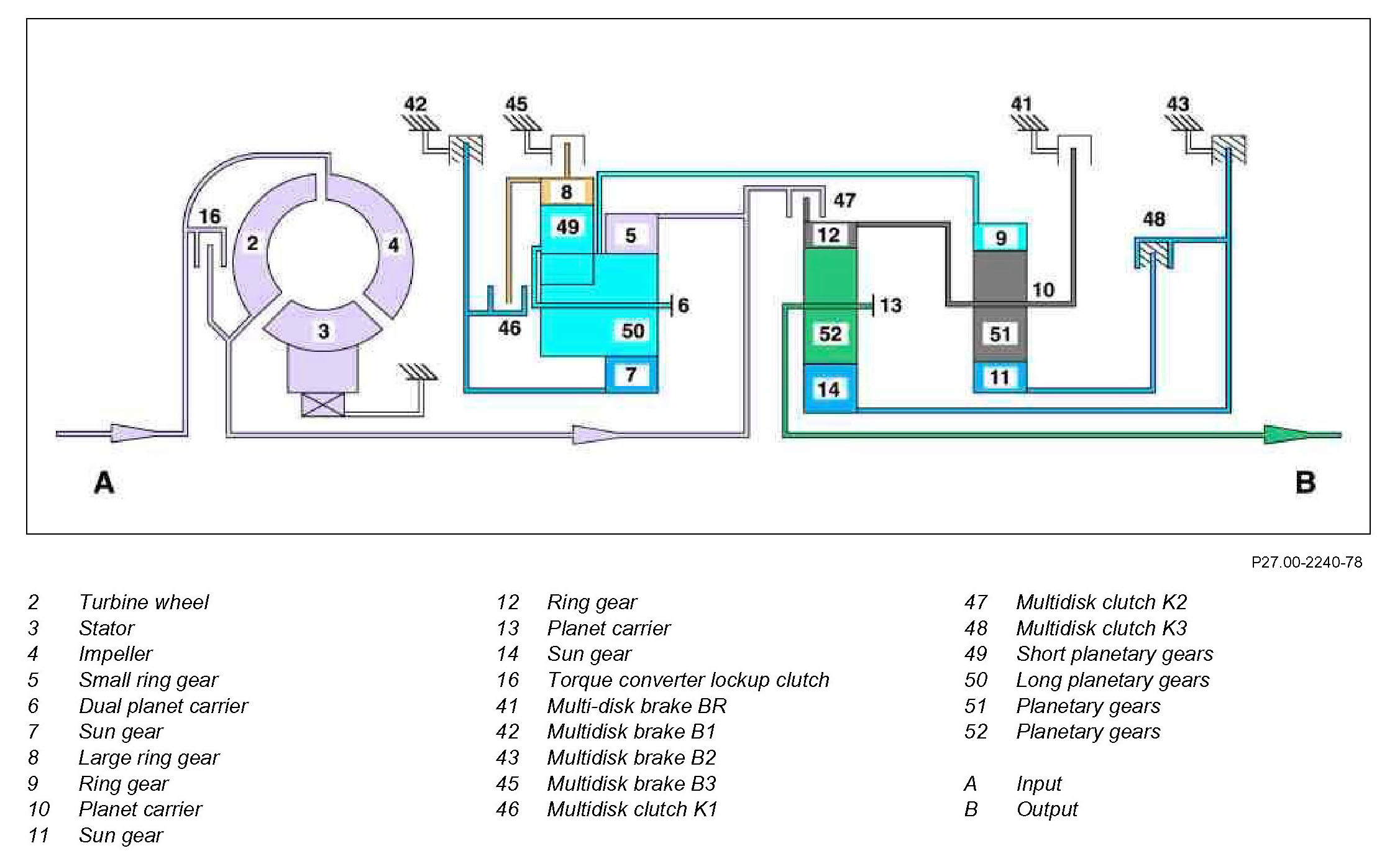 The ring gear (12) has a mechanical connection to the planet carrier (10) and rotates at the same speed. The planetary gears (52) roll on the stalled sun gear (14) and transfer the increased torque and reduced rotational speed to the transmission output shaft via the planet carrier (13). The transmission output shaft thus rotates with reduced transmission input speed in the direction of rotation of the engine.