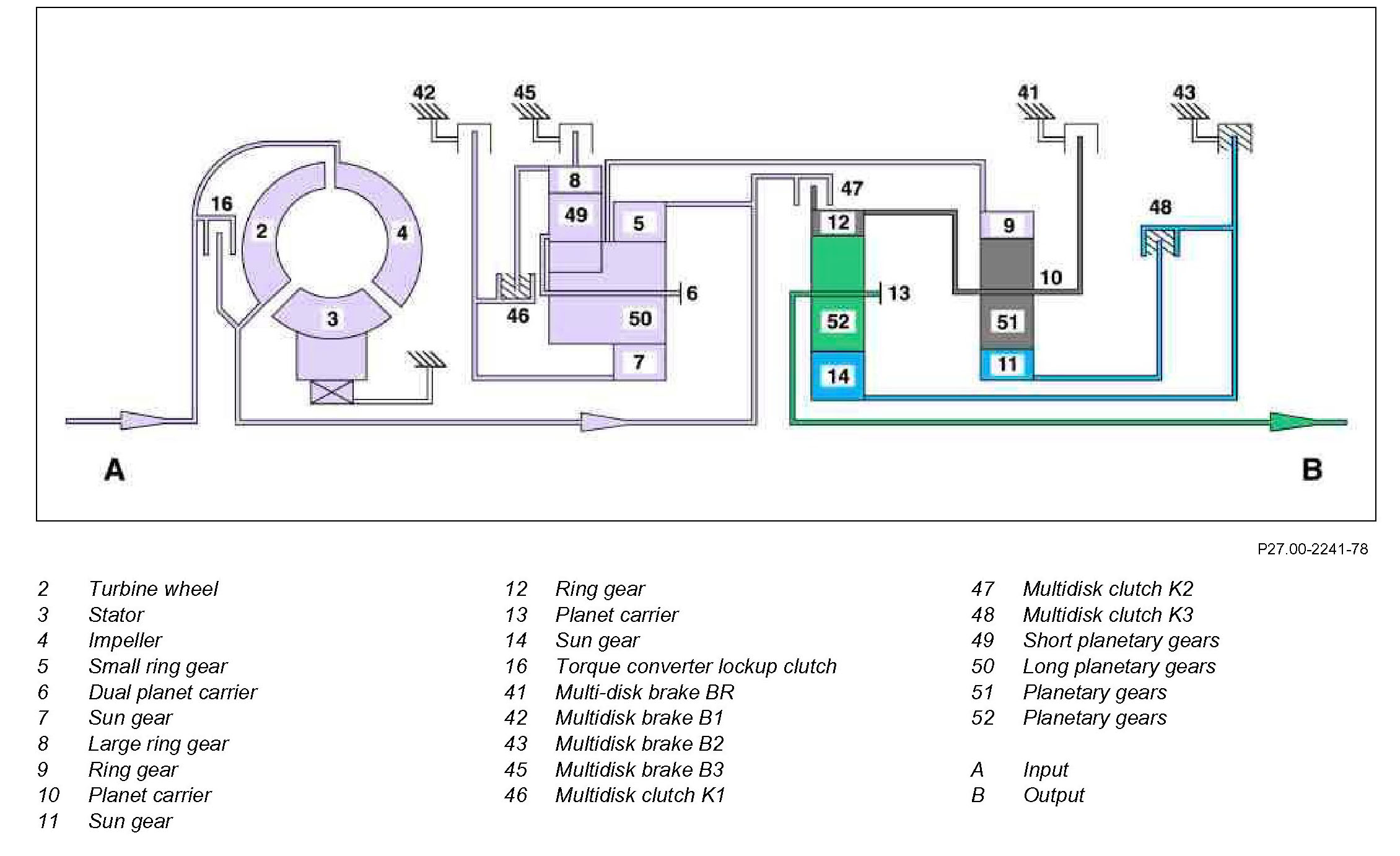 Due to the engaged multi-disk clutch K1 (46) the components of the Ravigneaux gear set are locked together and pass on the transmission input torque and transmission input speed unchanged to the ring gear (9).