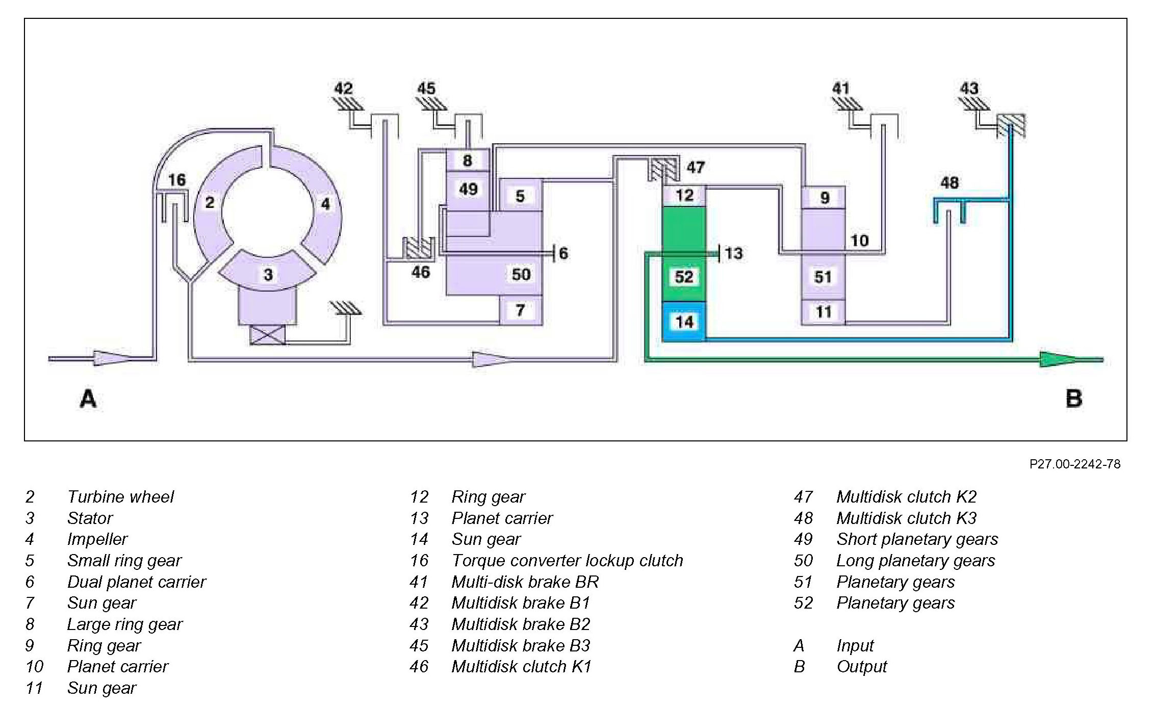 The engaged multidisk clutch K2 (47) means that the rpm of the ring gears (9, 12) are the same. As a result the rear single planetary gear system is locked and not actively involved in the gear ratio.