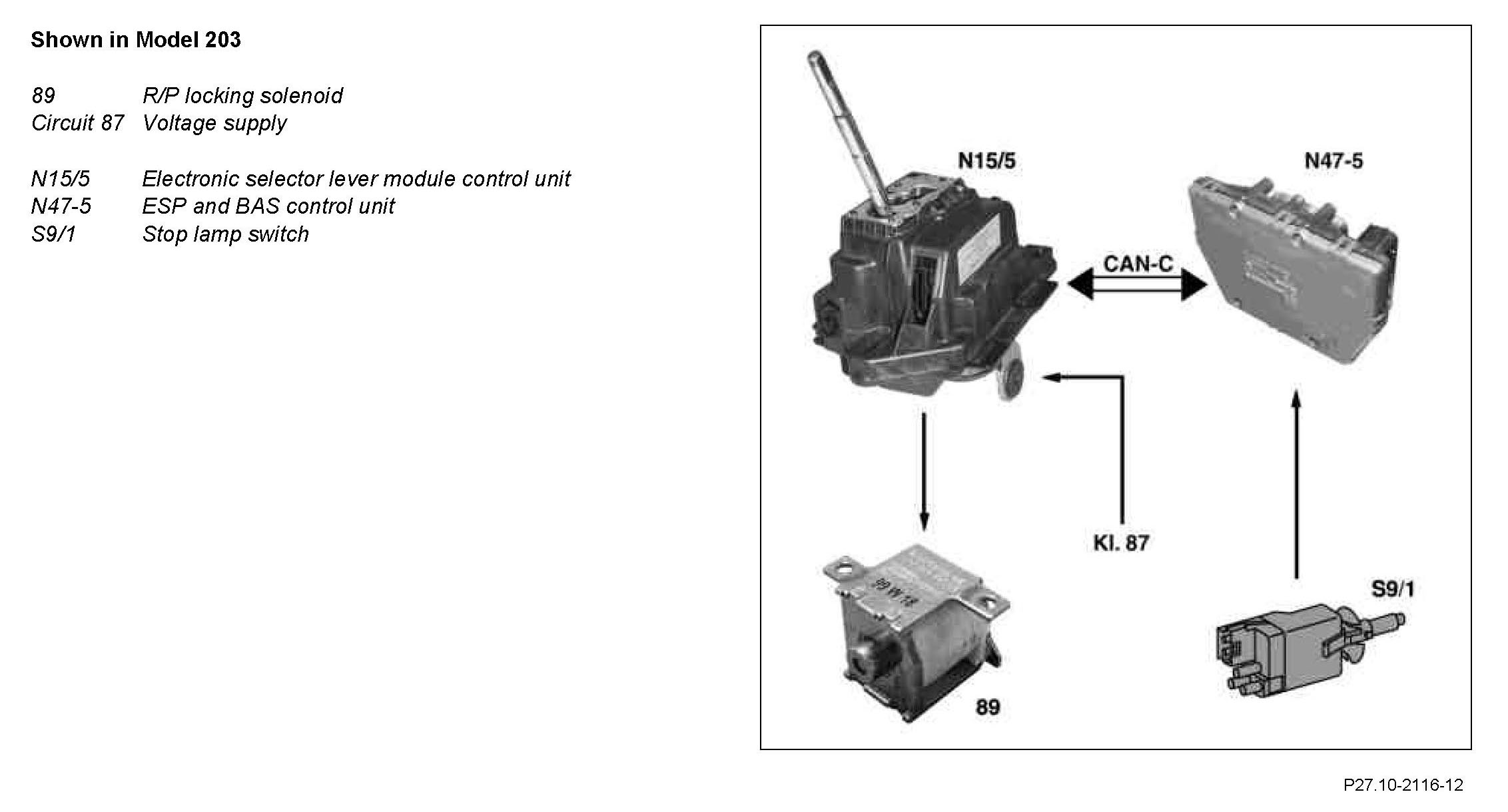 As of "circuit 15 ON" the electronic selector lever module control unit (N15/5) actuates the R/P locking solenoids, when selector lever position "P" is detected and the brake pedal and thus the stop lamp switch (S9/1) is operated. The R/P locking magnet (89) releases the selector lever thus allowing the selector lever to be moved away from position "P".