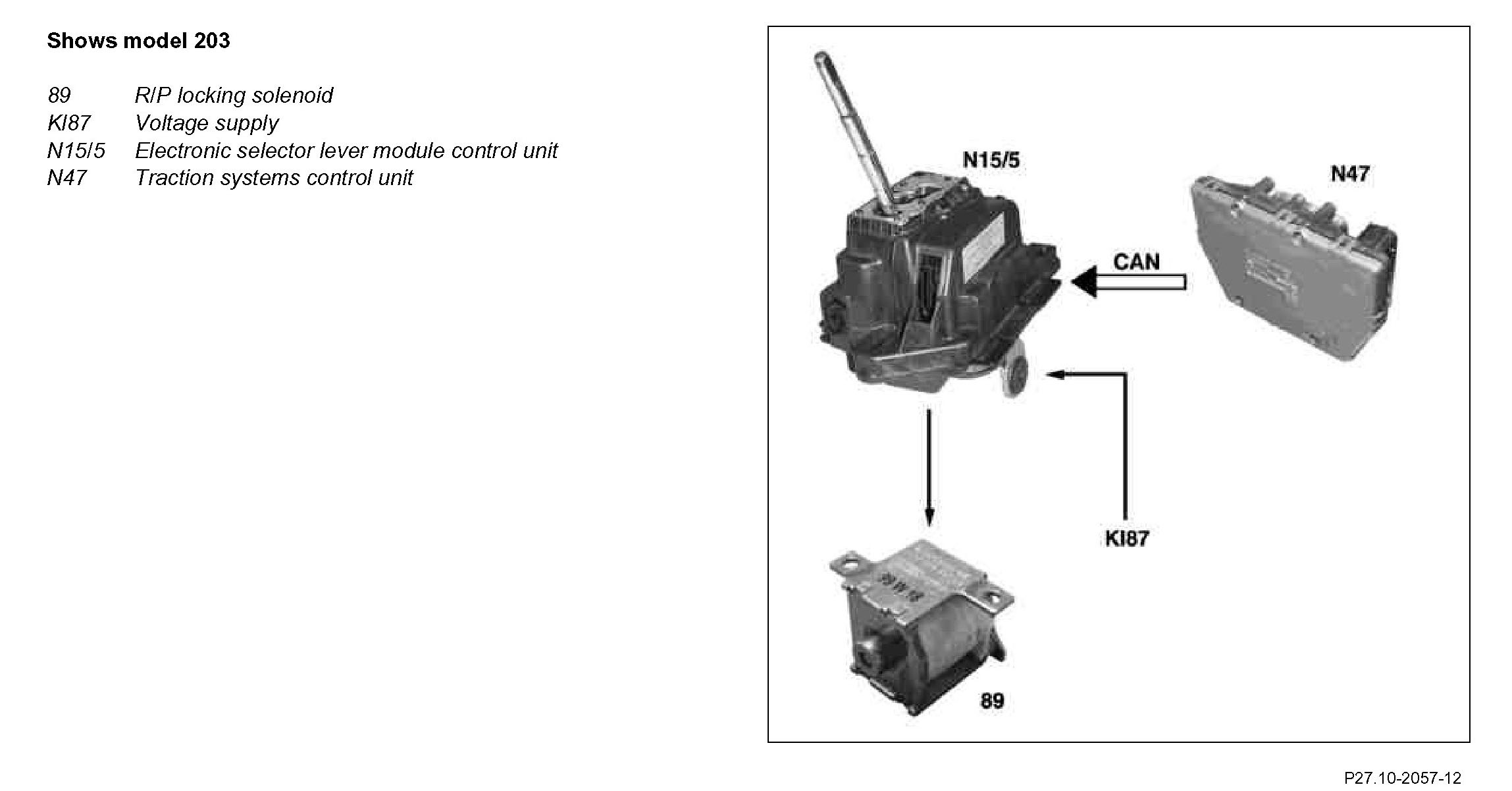 As of "Ignition: ON" the electronic selector lever module control unit (N15/5) actuates the R/P locking solenoids (89) when the brake pedal is depressed and selector lever position "P" is detected.
