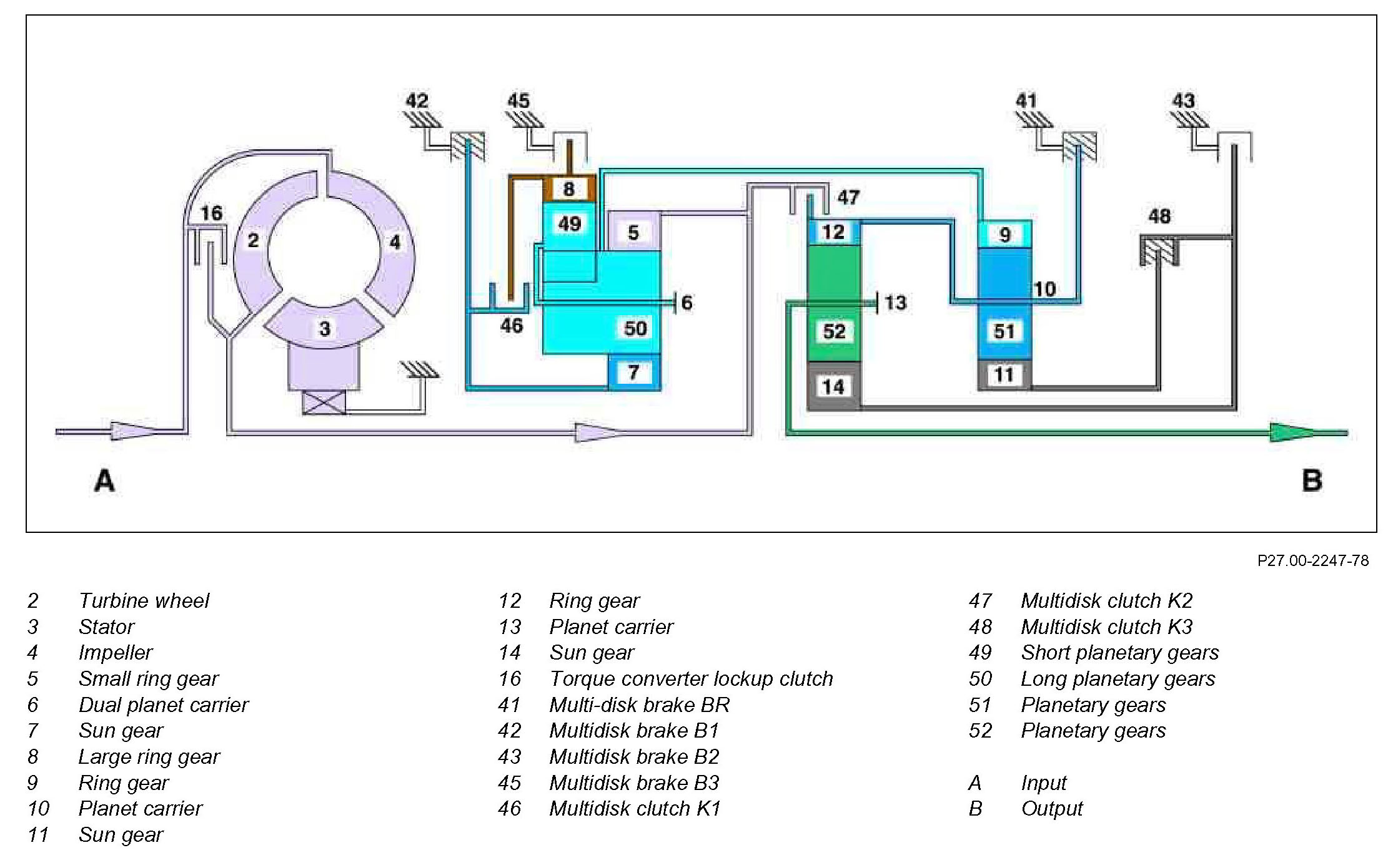 There is a connection between the sun gear (14) and sun gear (11) via the engaged multi-disk clutch K3 (48). As a result sun gear (14) rotates at the same speed and direction of rotation as sun gear (11) and drives the planetary gears (52). The increased torque and reduced rotational speed as a result are transmitted via the planet carrier (13) to the transmission output shaft. The transmission output shaft thus rotates at reduced transmission input speed opposite to the direction of the engine.