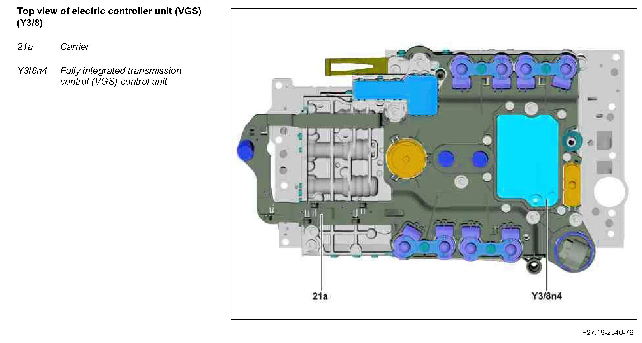 The fully integrated transmission control unit (VGS) is integrated in the electric controller unit (VGS) which is located in the oil pan at the bottom of the transmission.