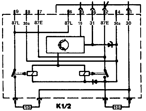 The voltage for the 5-speed automatic transmission control unit (N15/1) is supplied via the overvoltage protection relay (K1/2). It protects the electronic components from overvoltage. An overload is prevented by means of fuses. The 5-speed automatic transmission control unit (N15/1) is supplied by the terminal 87L (9).