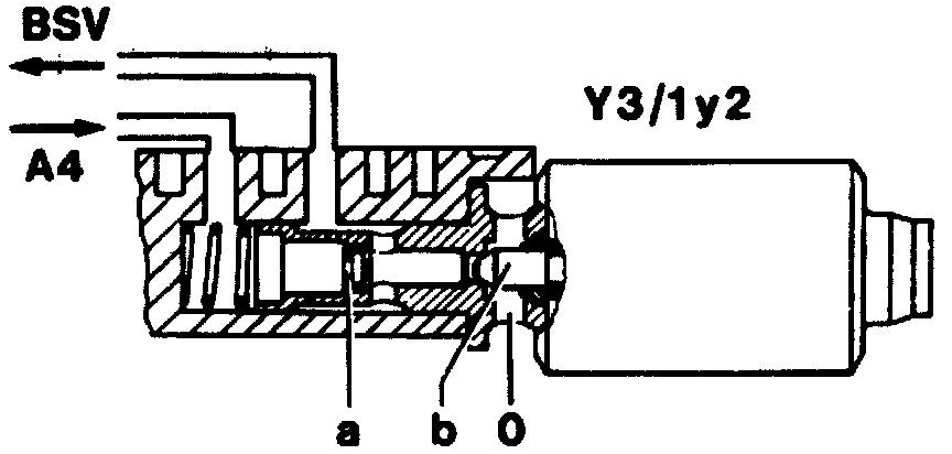 The pressure is fed in through the restrictor (a). The pressure used is the working pressure from 4th gear or higher (A4). The current level produces a particular opening of the valve needle (b), which represents a variable restrictor compared to the constant restrictor (a). This produces the control of the BSV pressure (valve pressure of shift valve BS).