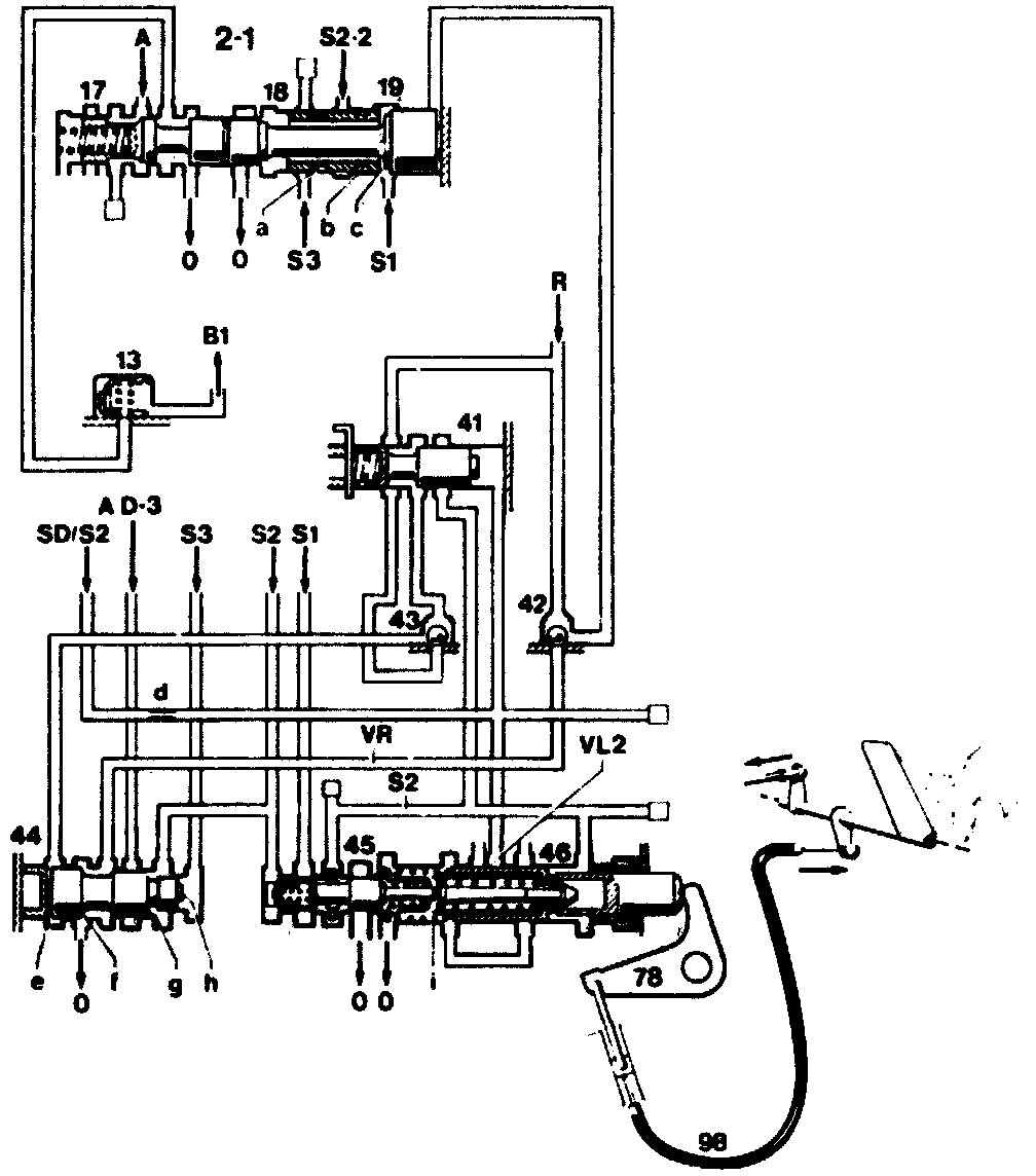 The governor pressure booster valve (44) is pressed to the right by the spring acting on the lefthand side. The valve (44) closes the zero outlet and at the same time opens the working pressure inlet "AD-3". Boosted governor pressure "VR is formed, which acts on the end face of the piston (19) and presses the command valve (17) into the position of 2nd gear.