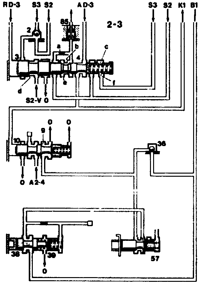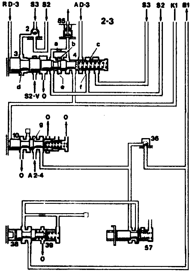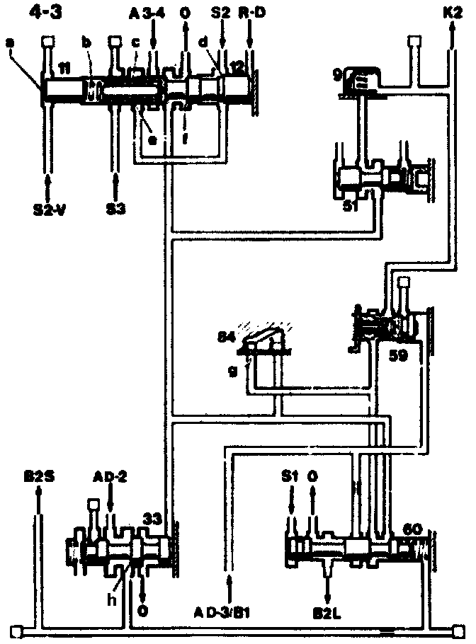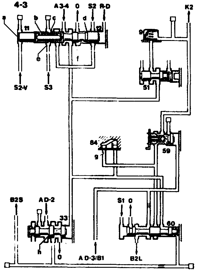 The valve (33) is pushed to the right by its spring. The shift side of the brake band piston (B2S) is connected to the working pressure inlet "AD-2". At the same time, the clutch K2 slowly empties through the restrictor (g). As soon as the release valve (60) is pushed to the left by the pressure in the spring chamber, the release side of the brake band piston (B2L) and also clutch K2 are drained unrestricted. The transmission has shifted into 3rd gear.