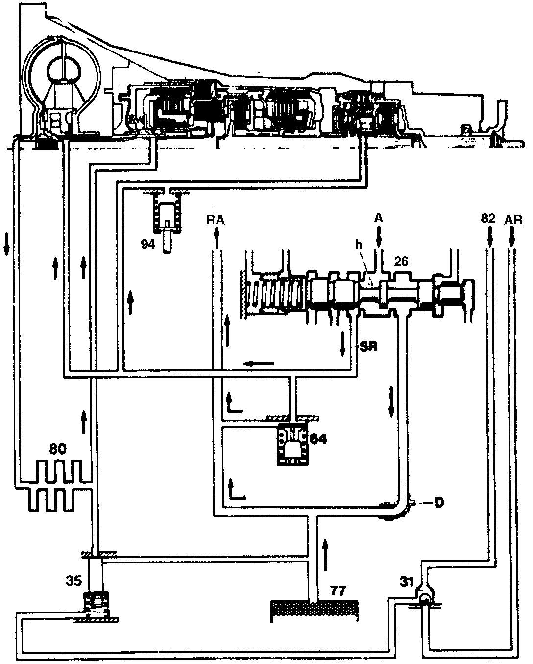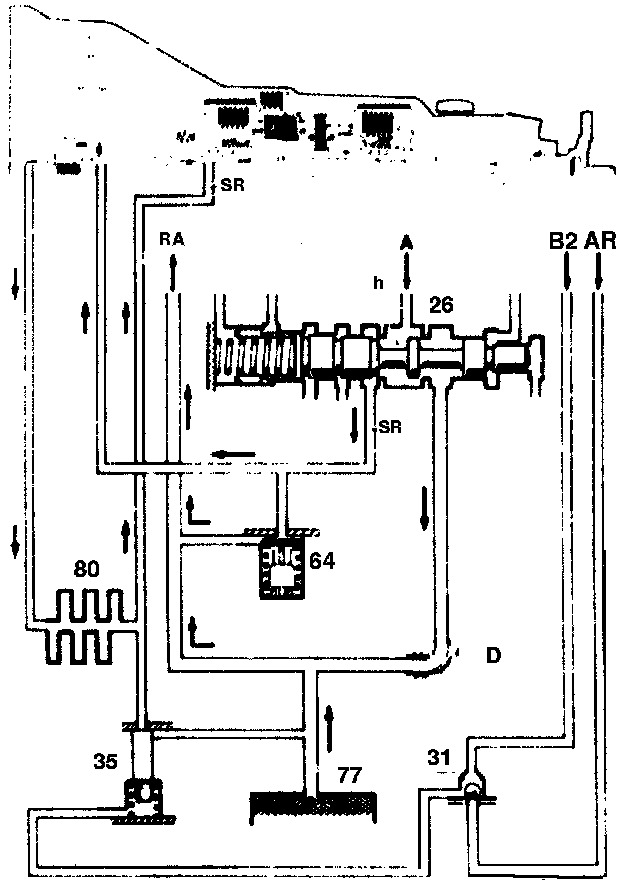The lubricating oil flows from he discharge edge (h) of the working pressure control valve (26) to the torque converter, from there to the oil cooler and back again to the transmission. It flows to the points at which it is needed for cooling and lubrication through the passages and drillings provided in the housings, shafts and gears.