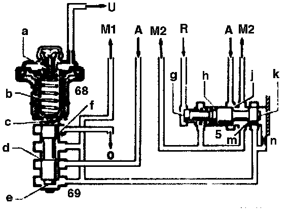 The "M1" modulating pressure system consists of the control valve (69) and a vacuum unit (68). The spring chamber of the vacuum unit is connected to the intake manifold of the engine. As the vacuum rises, the force of the spring (b) acting on the control valve (69) is weakened.