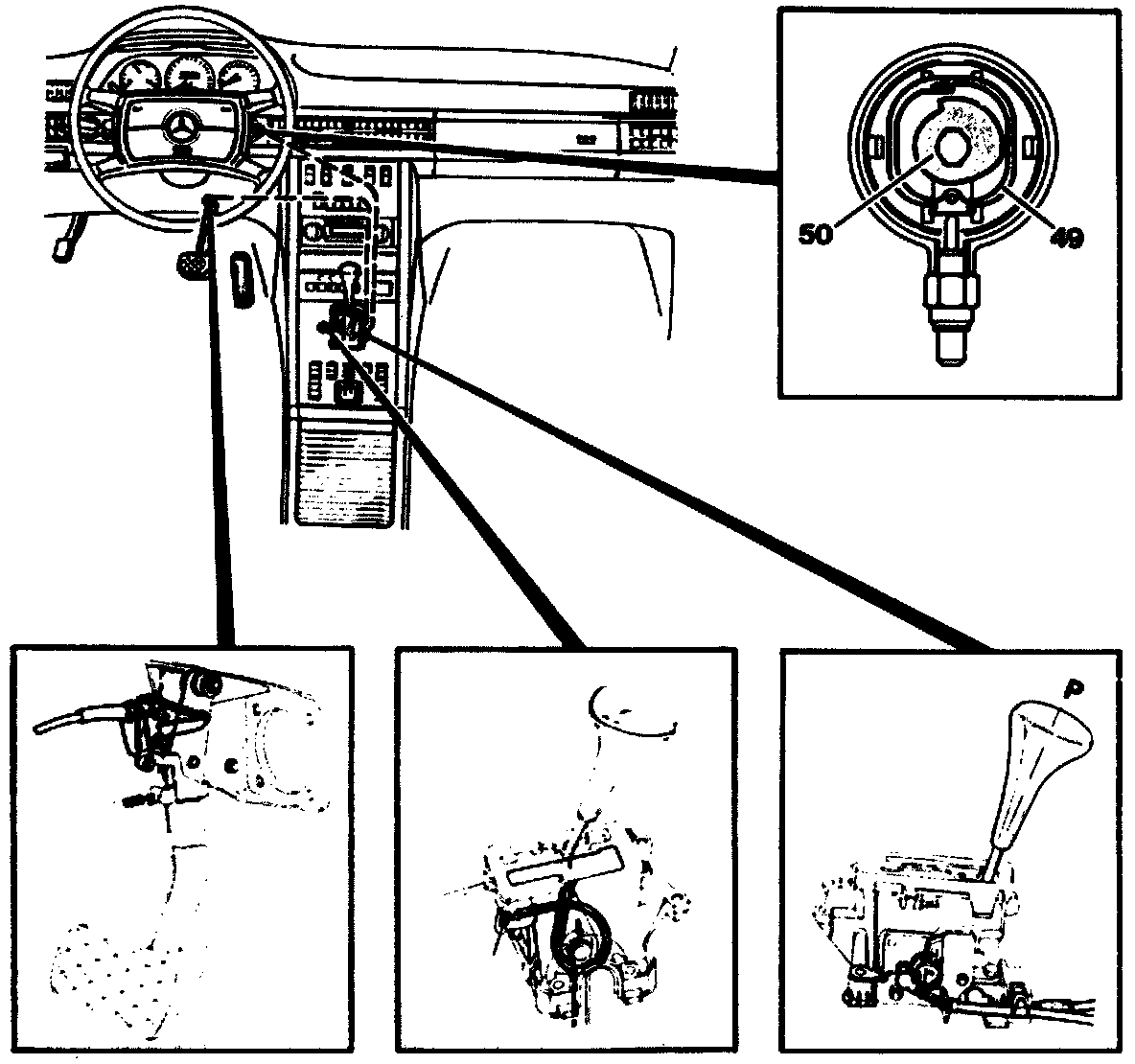 The locking levers (44B) and (44L) are engaged in the locking plate (48). The slide valve (49) in the steering lock releases the cam plate (50) which allows the lock cylinder to be turned back into position "0" and the key can be withdrawn.