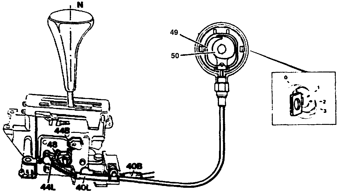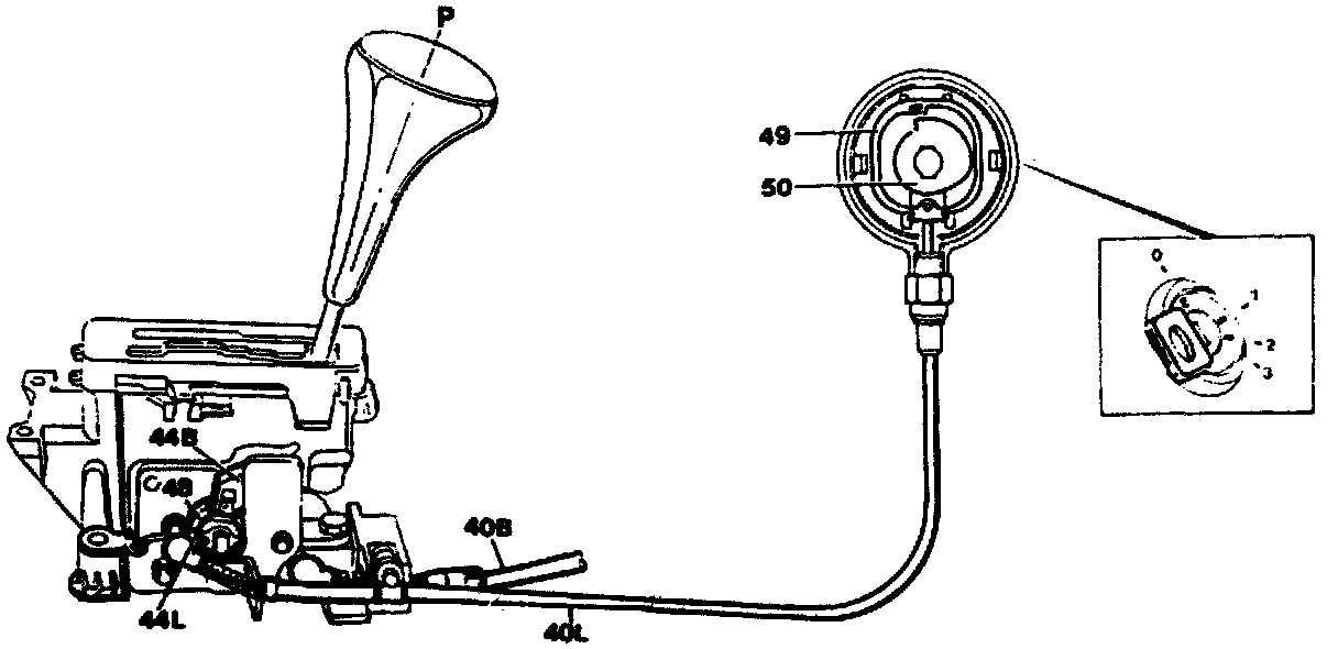 When the service brake is applied or the ignition is turned, the two locking levers (44B) and (44L) are lifted off the cam (48) by the Bowden cables (40B) and (40L) and the parking shift lock is deactivated.