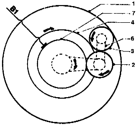 Driven by the wide planet gears (3), the narrow planet gears (2) orbit around the locked small sunwheel (7) and rotate the planet carrier (6) of the Ravigneaux planet gear set in the driving direction of rotation.