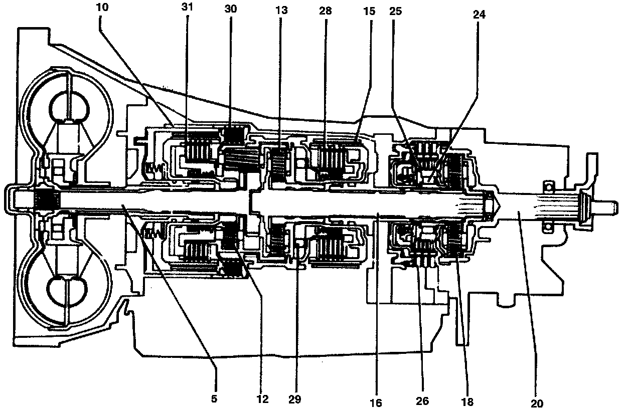 In 3rd gear the brake band B2 (15) is applied. Clutches K1(31) and KS (25) are engaged for power transmission. The freewheel F2 (24) is locked.