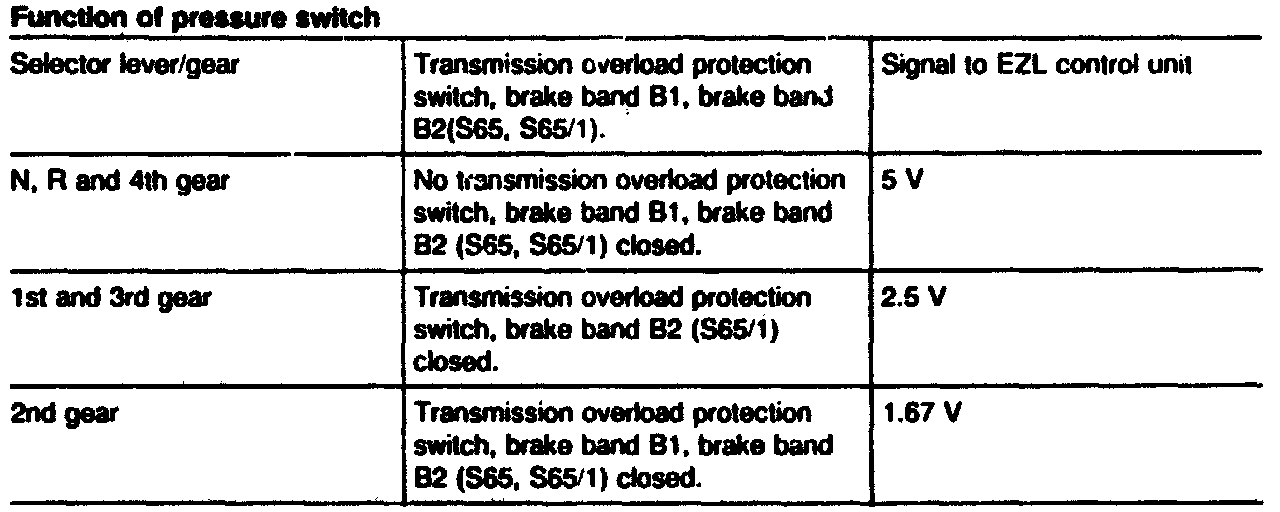 This transmission has two transmission overload protection switches, brake band B1 and brake band B2 (S65, S65/1). Both have a resistance of 1K ohm and send the transmission-side signal for retarding the ignition to the EZL control unit.