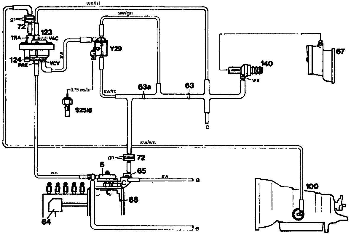 This vacuum which is tapped between the restrictors passes through the automatic transmission vacuum amplifier switchover valve (Y2S) to the vacuum amplifier (123) (connection VCV). As a result, a higher vacuum is fed in, which flows through connection (TRA) and the vacuum unit at the transmission to produce a lower modulating pressure. From approx. 50°C, the temperature switch (S25/6) opens, the ground connection to the automatic transmission vacuum amplifier switchover valve (V29) is interrupted. The controlled vacuum of the vacuum control valve passes through the automatic transmission vacuum amplifier switchover valve (V29) to the vacuum amplifier (123) (connection VCV).