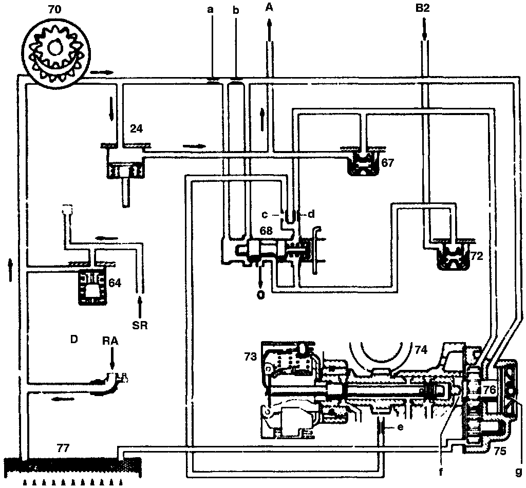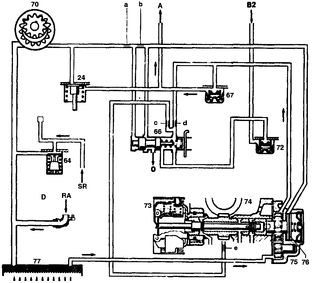 RA Excess pumped oil flow back through nozzle (D) of working pressure control valve into suction passage of primary pump