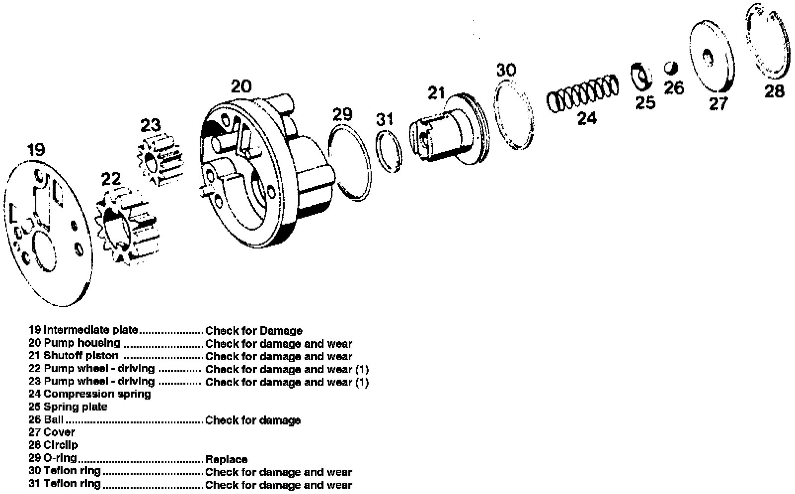 Check 0-ring (29) and teflon rings shutoff piston (30) and (31) for damage and replace, if necessary. Place 0-ring (29) into pump housing. Insert teflon rings (30) and (31) into shutoff piston (21).