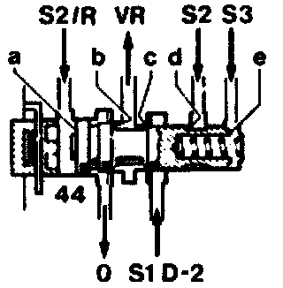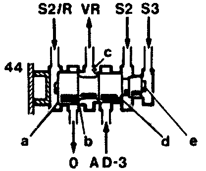 The pressure which passes to the end face (a) is the control pressure "S2" when the accelerator is in the idle throttle position, and the governor pressure at part to full throttle or at kickdown. The pressures at the annular surfaces (b) and (d) and also at the end face (e) counteract the pressure at the end face (a) and act on the valve (44) to push it into the control position.