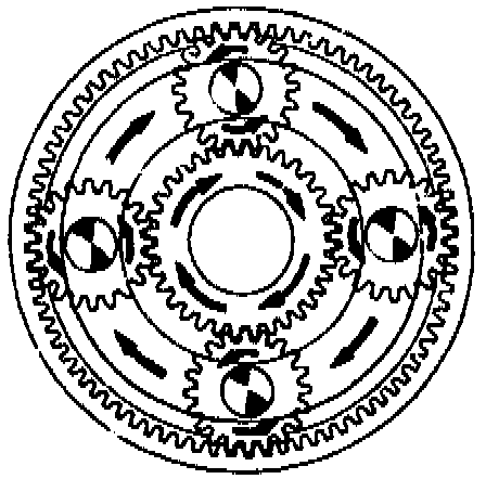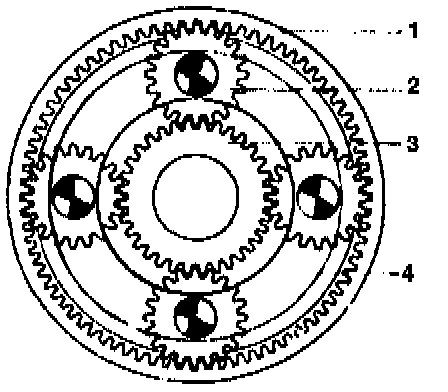A single planet set consists of an annulus (1), the planet gears (2) running in the planet carrier (4). and a sunwheel (3).