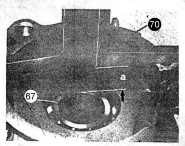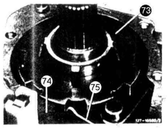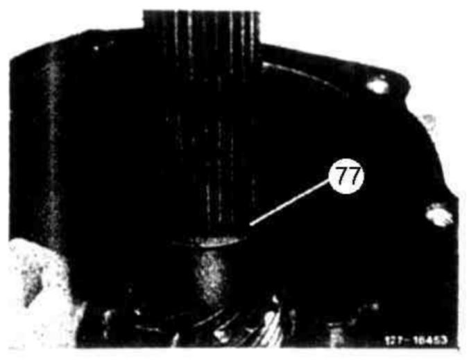 Assemble rear cover (70). Measure with depth gauge from sealing surface of rear cover (70) in relation to inner race of radial ball bearing (67) (dimension "a"). Deduct dimension "a" from dimension "b" to obtain end play "C". Compensate end play "C" to 0.3 - 0.5 mm by adding or removing compensating washer (77) under parking lock gear (73).