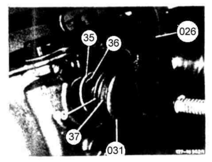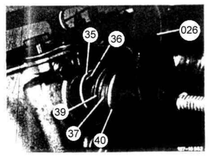 138 Screw-in spindle of assembly device (026), making sure that the thrust pin of the brake band piston B1 (37) enters the brake band and that the lip sealing ring (39) is not damaged.