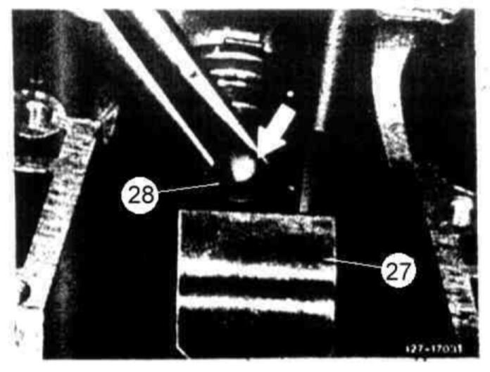 143 Insert thrust pin (28) with the large diameter (arrow) toward brake band B 2 (27).