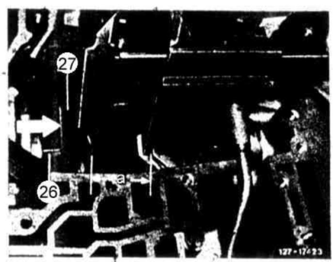 Also push brake band B2 (27) at supporting lug (27) in direction of thrust body (direction of arrow). Measure dimension "a" once again. The difference from both measurements provides release clearance "L". Adjust release clearance "L" to 5.5 - 6 mm by exchanging thrust pin (26) on brake band piston B2.